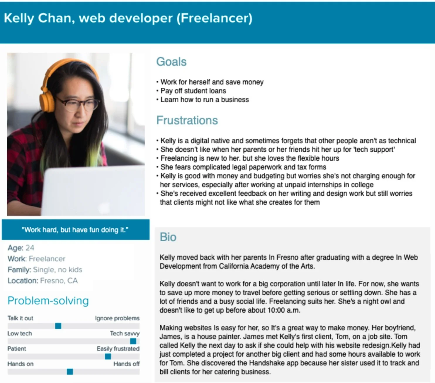 I was given two personas to research. These fictional examples represented Handshake’s target user types.